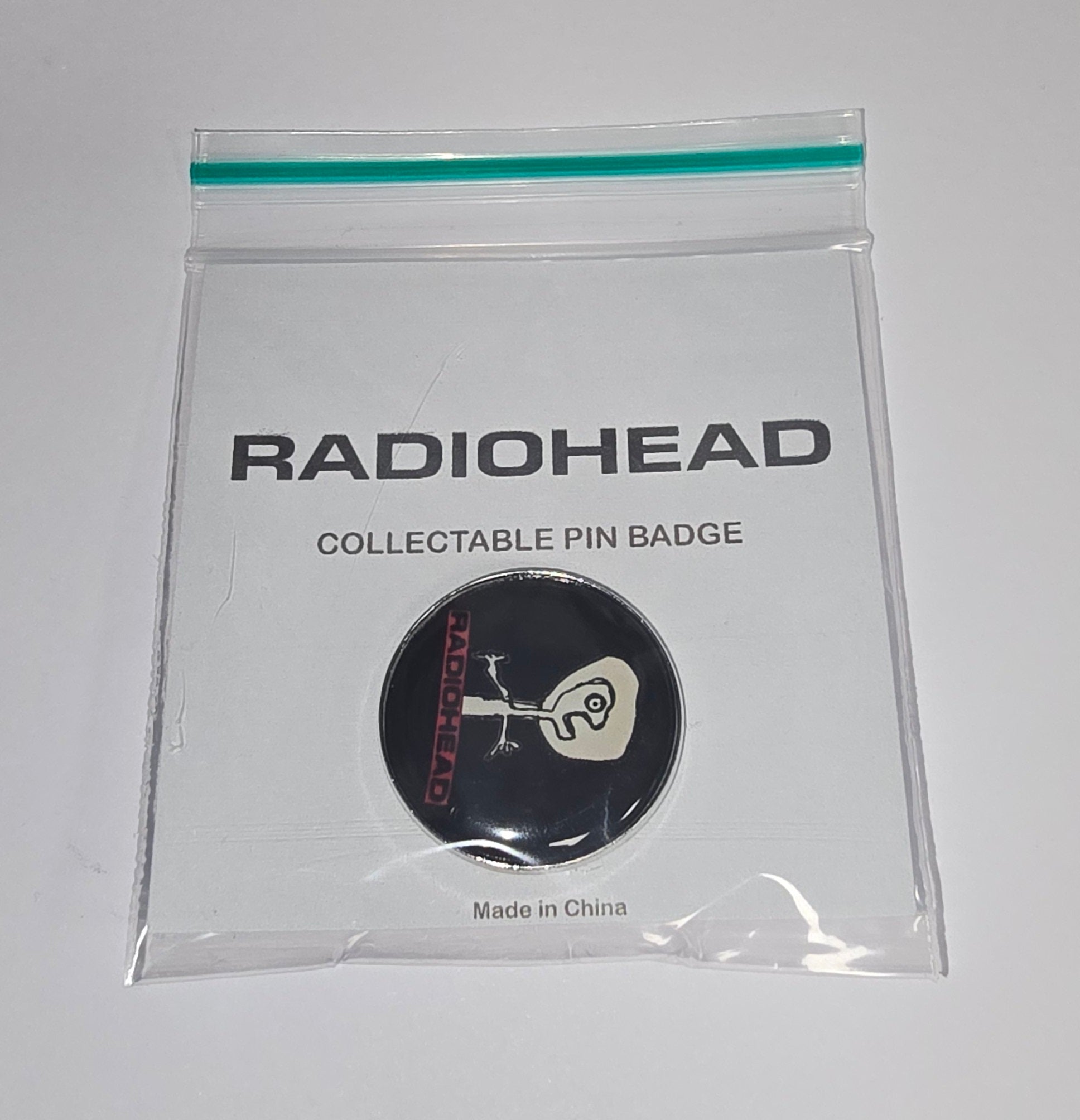 Radiohead pin badge featuring notable band motifs.